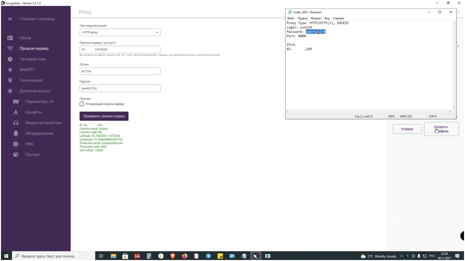 Переходим в раздел Прокси-сервер выбираем Тип подключения, в поля Прокси-сервер, Логин и Пароль вводим соответствующие данные из файла с прокси, нажимаем Проверить прокси-сервер, при успешной проверке создаем профиль.