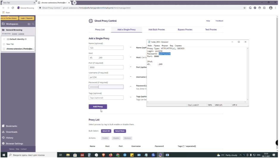 Открываем вкладку Add a Single Proxy. В полe Name вводим название прокси профиля, в поля Host, Port, Username и Password вводим соответствующие данные из файла с прокси и нажимаем Add Proxy.