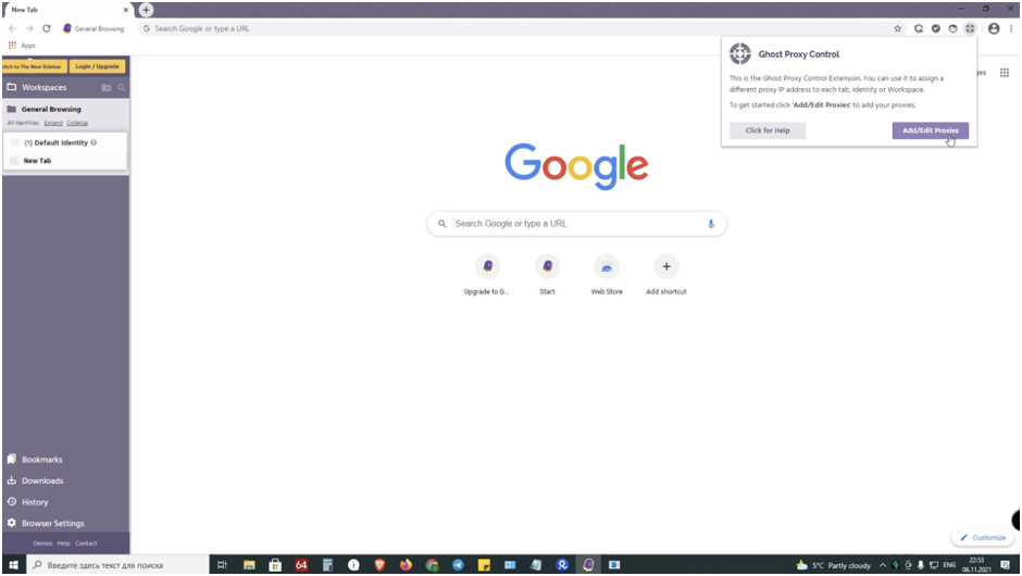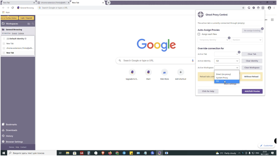 Для активации прокси снова открываем Ghost Proxy Control и в полях Active Identity и Active Workspace выбираем настроенный профиль прокси и нажимаем Reload для применения прокси для открытых вкладок.